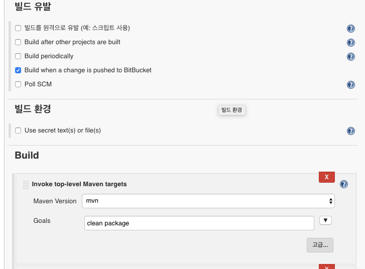 이후 Build when a change is pushed to BitBucket 설정을 하면 웹 훅 설정이 되어있을 경우 트리거가 발생해 이후 작업을 진행하게 된다.