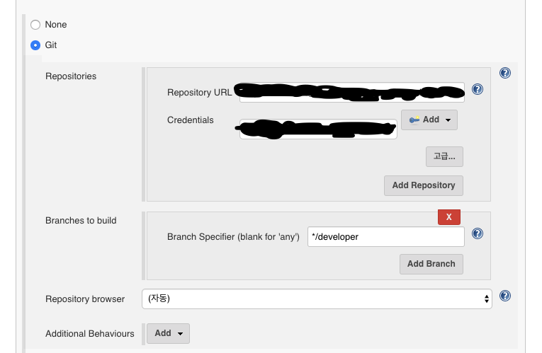 Branches to build 에 /developer 로 설정했다. 테스트 서버 developer 커밋에 도커 빌드를 할 것이기 때문이다.