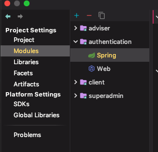 이후 모듈에서 +를 눌러 스프링 부트 프로젝트를 4개를 추가해준다.